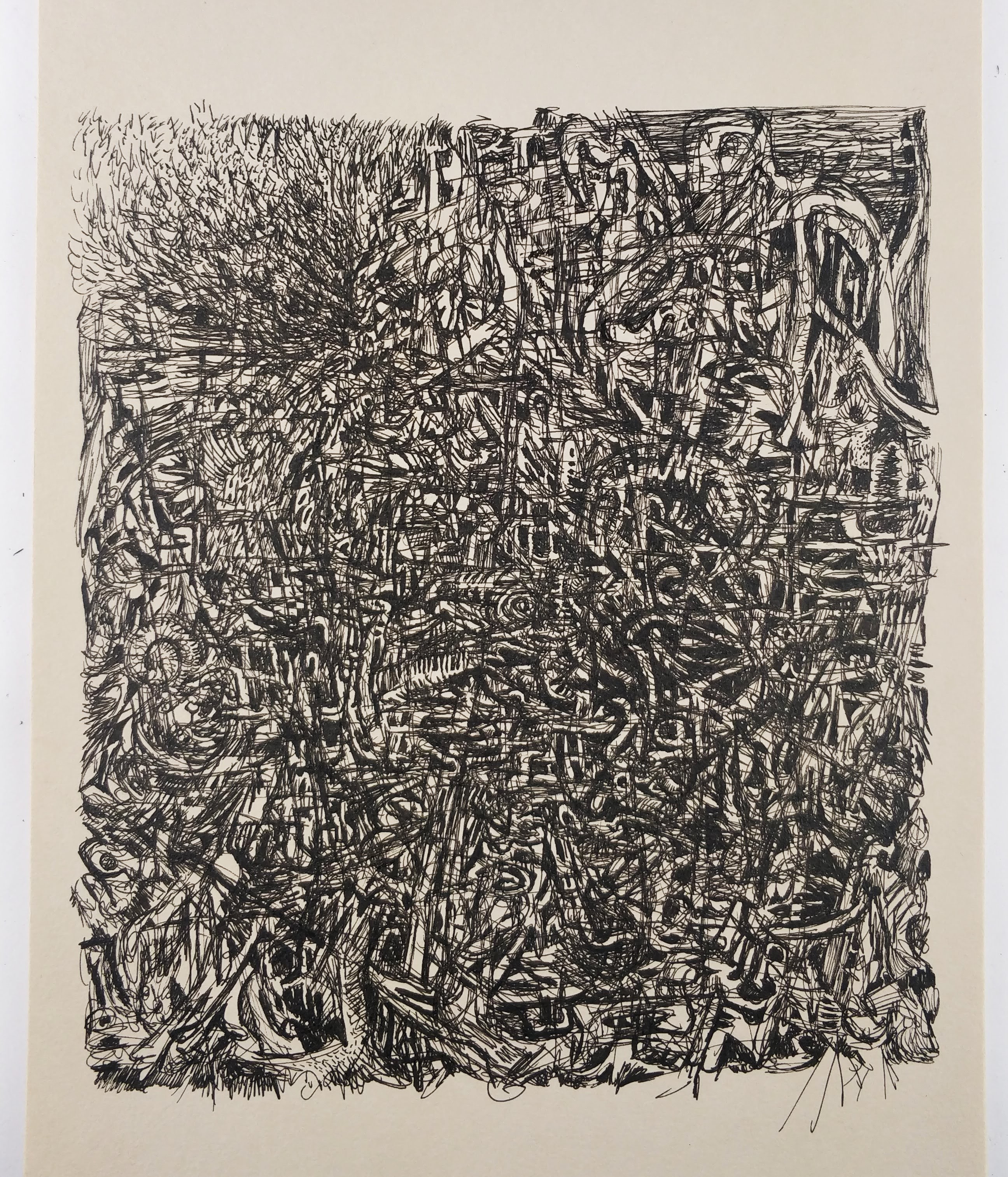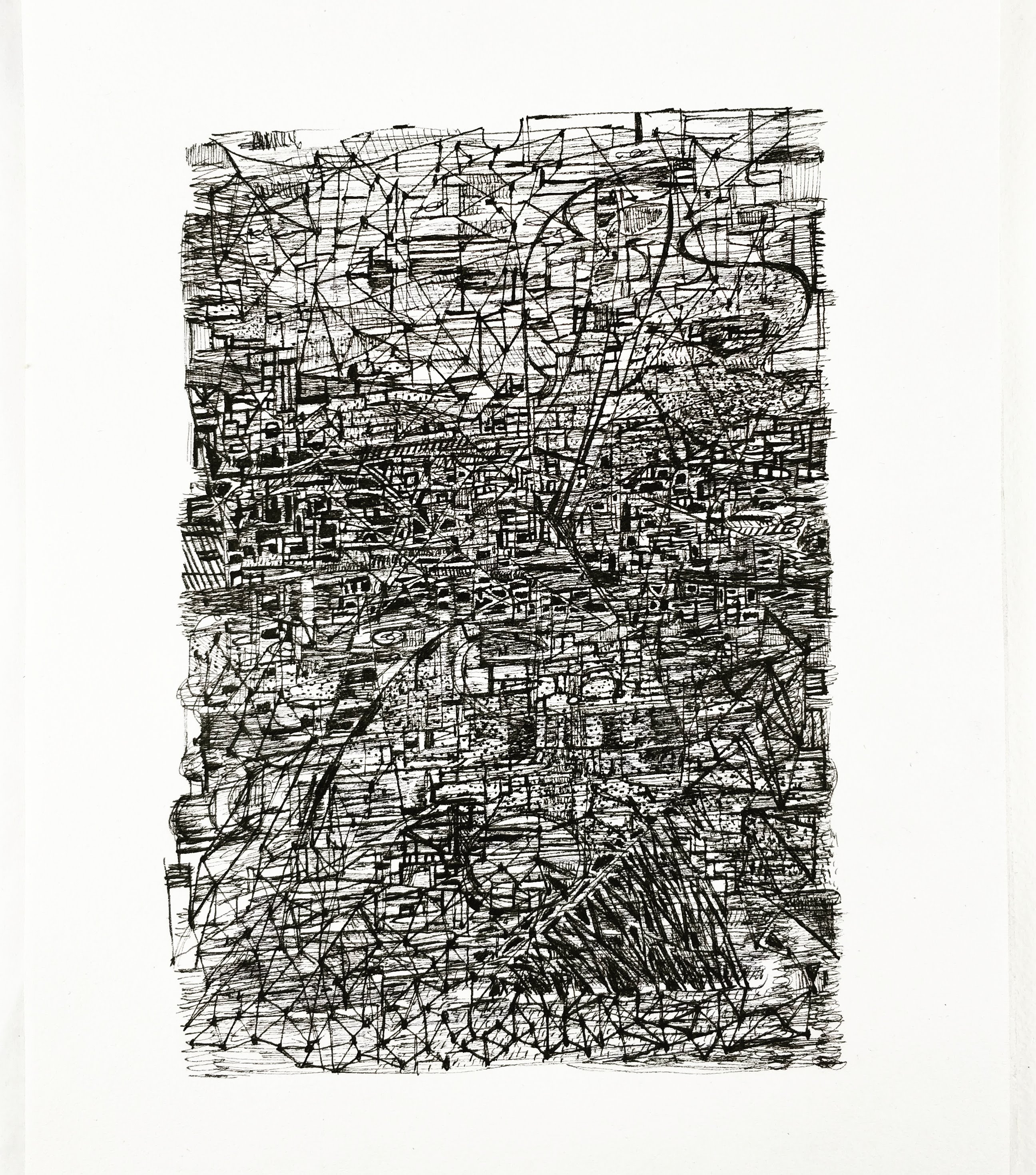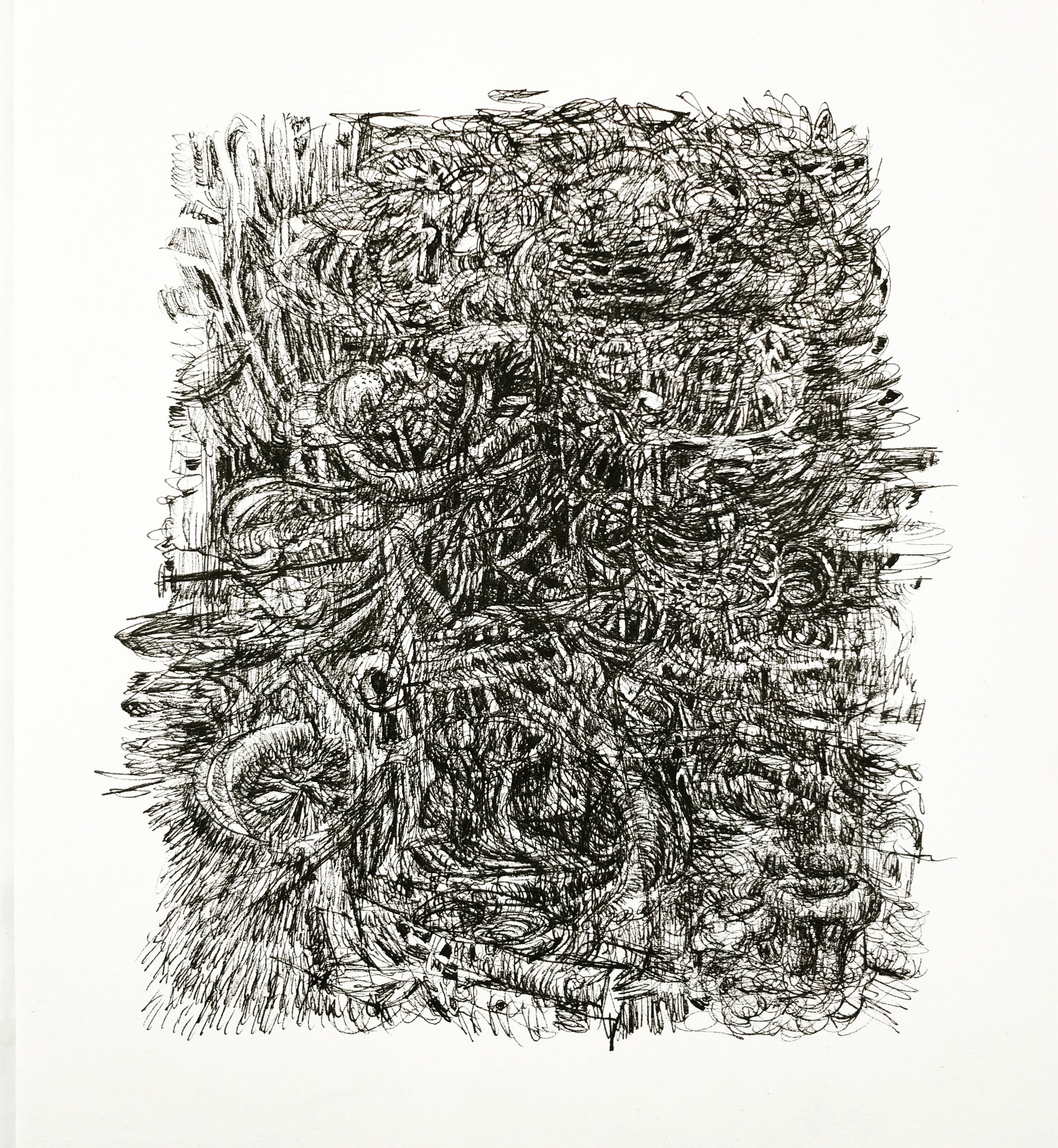 I have realised that many of my recent drawings have become increasingly busy and full. I think that this has something to do with questioning what drawing actually IS. Some of my earlier pen and ink drawings along this theme, were based on the idea of what Jonah might have seen on the inside of the big fish which saved his life. In the book of Jonah his prayer in the belly of the fish was partly a description: ….”The great deep engulfed me, Weeds were wrapped around my head…. I descended to the roots of the mountains. The earth with its bars was around me forever.” Jonah 2 vs. 5-6. My drawings on this theme were quite dark and tumultuous and claustrophobic, and many of my drawings are still going in that direction. When I draw a line (especially with a fine black pen), it becomes a hole in the page. A slit into another realm; but equally it become the edge of something else, something in the foreground, like the out-line that describes a cartoon character such as Mickey Mouse. Now of course things are not just black and white. i.e. the white of the paper, and the black of an ink ‘hole’, there are grey things too, which are perceived as ‘in-between’. The black ink which makes holes in the page has to describe those things too. One can’t always just make outlines of things to show them as big or small to describe their distance in space away from the viewer. One has to use black lines to describe things which are in shadow too. Working with black ink creates this conundrum. It’s like trying to slice a hair lengthways.