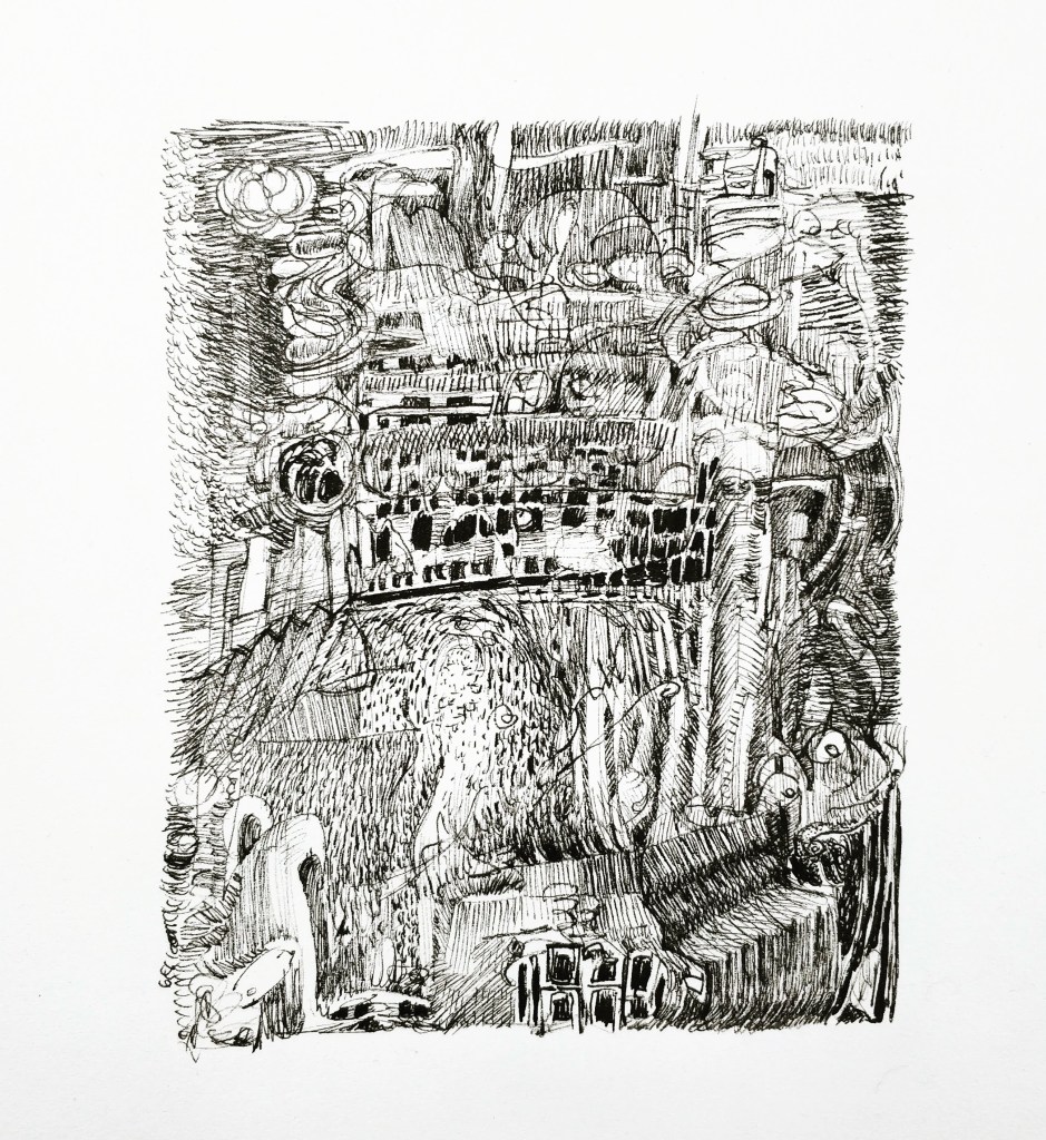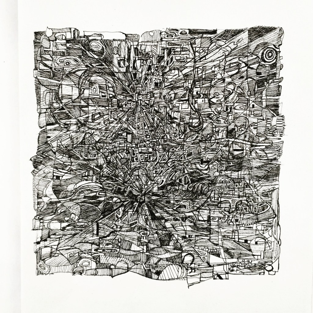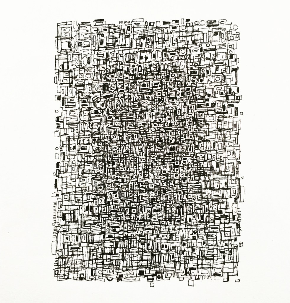 My recent drawing ‘compositions’ remind me of the lace my father used to produce and in this way I feel like I have been somehow following in his footsteps. The intricate threads in lace knitting are carefully controlled in their density, allowing gaps, holes, or loosely bound threads which permit the lace to be see-through in places. In other places the threads are so dense that they create a white floral design or pattern. However, the line in a black ink drawing seems to do the opposite of the white lace thread in a lace sample. In a pen and ink drawing one is constantly, simply, drawing the dark gaps ‘beyond’, and allowing the white of the paper to be formed by those gaps. (This process also reminds me of sculpting with hammer and chisel – reduction process – where one is constantly creating gaps and negative spaces in a solid object to reveal a form). There are places however, in my drawings, that I think clearly begin to resemble my father’s finely woven see-through lace, such as the areas of loosely drawn cross-hatched lines, or larger blocks of black. I find this idea very satisfying!