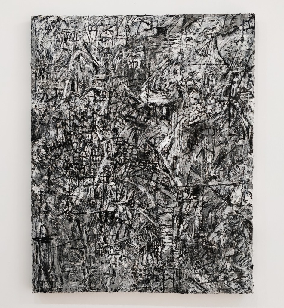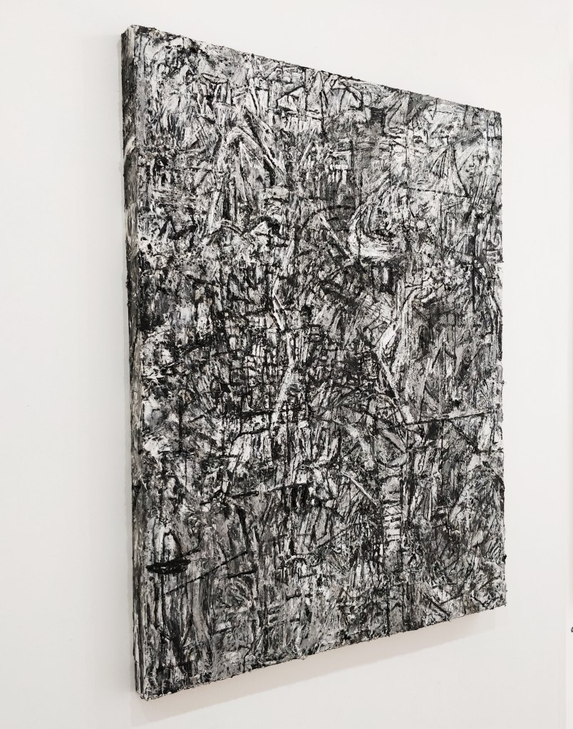 On a purely visceral level the works also reverberate with each other… Walter’s pieces attempt to suck the colour from the room, but James’ work keeps providing it… Mary promotes line and texture but Angele’s work denies it… this exhibition has contrasts, similarities and stories ‘in between’, and will keep a visitor busy!