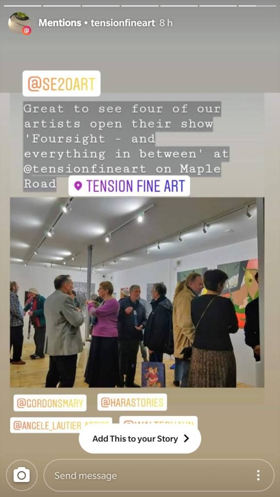 Thanks to all who attended my group show preview with three other members of the SE20 Group. What a great night. “Foursight, and everything in between”